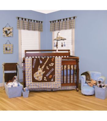Storage Baskets. Web exclusive! Trend Lab baby bedding offers your nursery lots of colorful, stylish, classy and elegant options for decorating your little babe's room, such as this rockin' collection. The 4-pc. crib bedding set includes a sectional bumper covered in fun blue, orange, tan and brown patterns. Quilt (resting on bed) is a patchwork of plaid, musical notes and guitars. Also includes blue crib sheet and 15" long box pleated bed skirt. Sold separately, choose from the following accessories: 3-pc. crib set (quilt, bed skirt, crib sheet) or a bumper with ties ... Read more
